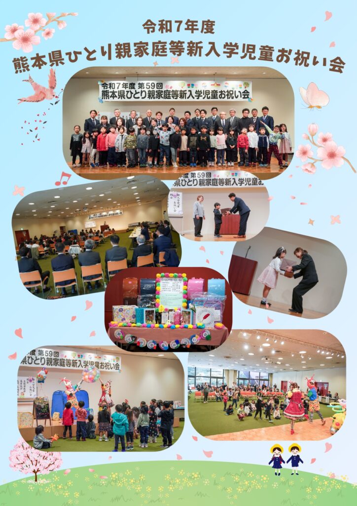 令和8年1月25日(日)、熊本県立劇場にて令和7年度熊本県ひとり親家庭等新入学児童お祝い会を開催しました。熊本県共同募金会様、熊本善意銀行様、熊本江南ロータリークラブ様、熊本商工会議所青年部様、村瀬鞄行様から、ランドセルやリュックサック、水筒、文具セットのお祝い品を寄贈いただき、児童一人ひとりに贈呈されました。